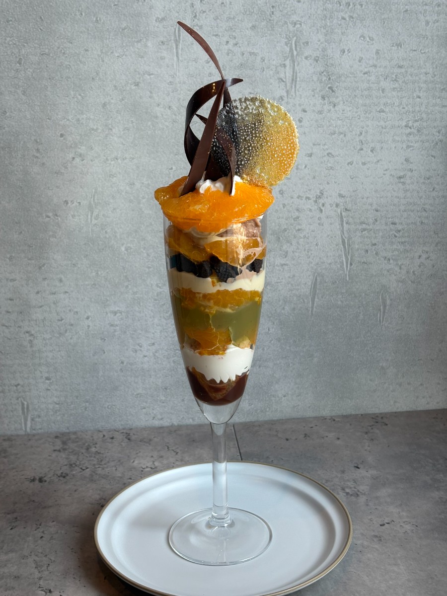 - 冬の新作 洋梨とキャラメルチャイのパフェ<div>トップにはチャイのアイス、フレッシュの洋梨でカスタードパイ風に仕立てました。</div><div>瑞々しい洋梨と濃厚なチャイアイスから始まり、グラス上部の洋梨のグラニテで口直し。金木犀と洋梨のグラニテがさわやかさを演出します。中央には洋梨とキャラメルソースの新たなマリアージュの層にチャイのパンナコッタで冬の季節感じる味わいに。最後ははちみつレモンの洋梨のマリネが全体を引き締めます。</div>