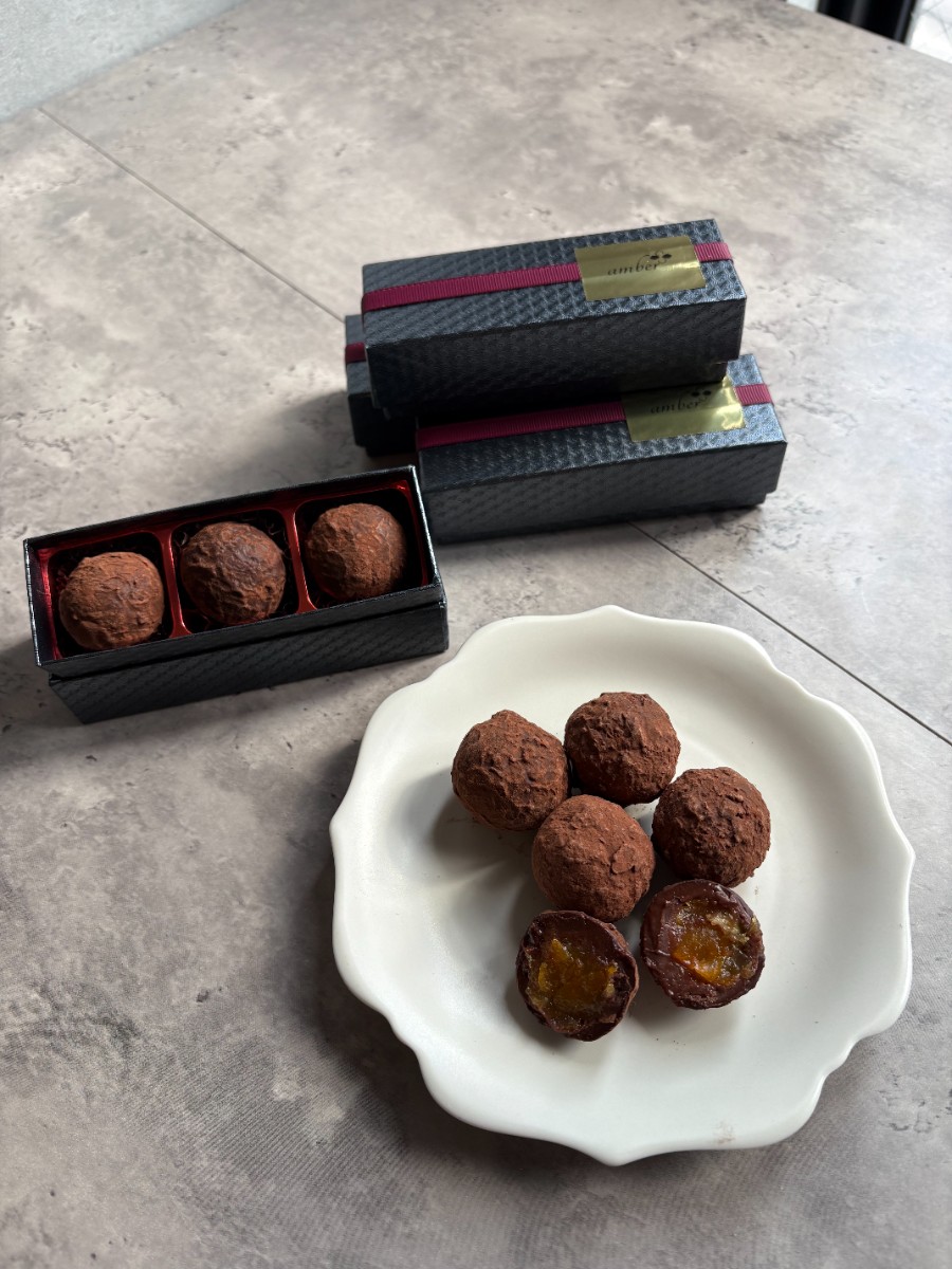 2026年amberのチョコレートコレクションは金柑の生チョコトリュフ、晩白柚ショコラ、アマンドショコラ。
